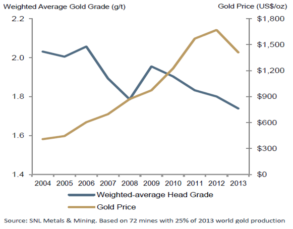 Wir sehen eindrucksvoll anhand der obenstehenden Charts wie die Gewinne der großen Goldproduzenten einbrachen. Selbst ohne Sonderposten wie Sonderabschreibungen sanken die Quartalsgewinne von über 4,2 Milliarden US-Dollar im 3. Quartal 2011 im Umfeld des Goldpreishochs auf -1,7 Milliarden US-Dollar im Schlussquartal 2013 und lagen auch im 3. Quartal 2015 trotz der vorübergehenden Goldpreiserholung bei -57 Millionen US-Dollar. Für das 4. Quartal 2015 liegen noch nicht alle Ergebnisse vor, aber der größte Goldproduzent Barrick Gold kam auf einen Verlust selbst unter Ausklammerung von Sonderabschreibungen und anderen Sonderposten in Höhe von 348 Millionen US-Dollar nach einem Gewinn von 137,5 Millionen US-Dollar im Vorquartal. Ein desaströses Bild ergibt sich im zweiten Chart, wenn wir die außerordentlichen Erträge und Aufwendungen wie Sonderabschreibungen berücksichtigen. Allein im 2. Quartal 2013 betrug der Verlust 18,4 Milliarden US-Dollar. In jedem Quartal des Jahres 2015 fielen Verluste an. Im 3. Quartal 2013 waren es 1,14 Milliarden US-Dollar. Für das Schlussquartal liegen noch nicht alle Daten vor, aber allein Barrick Gold kam auf einen Verlust von 2,6 Milliarden US-Dollar. Unser Fazit lautete daher: Die Goldpreise des 4. Quartals 2015 von unter 1100 US-Dollar je Feinunze reichen den großen Goldproduzenten nicht, um kostendeckend zu arbeiten. Auch wenn ein Rohstoffpreis für eine gewisse Zeit unter die Gewinnungskosten fallen kann, so bietet ein solches Umfeld wie beim Gold im Jahre 2015 hervorragende Chancen. Wären da noch die rückläufigen Neuentdeckungen von GoldHier zeigen wir einmal, dass im folgenden linken Chart 1995 die Neuentdeckungen von Gold im 3-Jahresdurchschnitt ihr Hoch erreichten. In der Ausgabe Januar 2016 des Gloom & Boom & Doom Report von Marc Faber wurde der Chart bis 2013 gezeigt. Hier der Ende 2015 publizierte Chart mit IST-Daten bis 2014: Demnach wird für 2015 ein Hoch der Goldförderung erwartet. Der Hochpunkt der Entdeckungen neuer Goldfunde im Jahre 1995 lässt einen Förderpeak im Jahre 2015 erwarten. Exakte Prognosen verbieten sich, aber der große Trend sollte aufgrund der starken Rückgänge der Neuentdeckungen stimmen. Der Rückgang des Goldgehalts je Tonne geht aus dem zweiten Chart dieses Abschnitts hervor. Auch ohne neue Dollarschwemme, die jedoch nur eine Frage der Zeit ist, stimmt das große Bild also für Gold. Genau zu diesem Thema veröffentlichte die Financial Times im Januar 2016 einen Artikel mit ähnlichem Inhalt. Zitiert wurde der Chef von Barrick Gold, der fallende Goldgehalte und Produktionsniveaus, einen Mangel an Neuentdeckungen und die Verlängerung des Zeitplans bei der Verwirklichung neuer Projekte sieht. Schauen wir uns auch den Verlauf der Investitionen der Goldminen im HUI-Goldminenindex an. Mit Ausnahme von Sibanye Gold sind alle HUI-Mitglieder berücksichtigt. Im 4. Quartal 2012 erreichten die Investitionen mit 6.390 Millionen US-Dollar ihr Hoch und im 3. Quartal 2015 waren sie auf nur noch 2.049 Millionen US-Dollar gesunken. Die Aussagen des Chefs von Barrick decken sich voll und ganz mit unseren Analysen, so dass der Wunsch hier nicht der Vater der Gedanken dieses Vertreters der größten Goldmine ist. Barrick förderte im 3. Quartal 2015 1,663 Millionen Goldunzen. Newmont, die wir aufgrund der Ertragslage vorziehen würden, kam auf 1,34 Millionen Unzen, Anglo Gold Ashanti auf 0,97 und Goldcorp auf 0,92 Millionen Unzen, um einige Flaggschiffe der Branche zu nennen. In unserem Silberbulletin vom 23. Januar 2016 schrieben wir daher treffend: "In Indexpunkten lag der HUI mit 99,19 am 19. Januar 2016 so niedrig wie seit Juli 2002 nicht mehr. Dies liegt daran, dass heute weit mehr Aktien von den Unternehmen herausgegeben sind als damals." Und wir zogen unser Fazit: "Unseres Erachtens sollte die Marke von 90 bis 100 eine starke Unterstützung sein. Wenn der Goldpreis hier dreht, verfügen die Goldminen über eine Hebelwirkung. Denn aus Verlusten werden bei steigenden Goldpreisen schnell Gewinne." Bis zum 27. Februar 2016 konnte der HUI-Goldindex auf 172,71 Punkte zulegen. Sie sehen, dass auch mit Goldminenaktien noch Geld verdient werden kann. Wenden wir uns den Förderkosten für Silber zuWir bilden unten einen Chart ab, der die Cash Costs nach einer Analyse aller primären Silberproduzenten durch das Analysehaus CPM zeigt. Diese beinhalten direkte Förderkosten, Verhüttungs-, Raffinierungs- und Transportkosten, Arbeitskosten, Strom- sowie Energiekosten und sonstige direkte Kosten. Es handelt sich nicht um die sogenannten Total Cash Costs, die auch noch die buchhalterischen Kosten wie z. B. Verwaltungskosten, Abschreibungen auf Maschinen, Förderabgaben, Steuern auf die Produktion enthalten. Kennen Sie den Begriff der Grenzkosten oder auch Marginalkosten? Hier geht es darum, welche Kosten durch die Produktion einer zusätzlichen Mengeneinheit eines Produktes, hier eines Rohstoffes, entstehen. Nun zeigen wir im folgenden Chart neben den Durchschnittskosten das 90. Perzentil der Förderkosten. Was verbirgt sich dahinter? Es gibt an, dass 90 Prozent der Silberförderung mit Kosten unterhalb des 90. Perzentils und 10 Prozent oberhalb stattfinden. Die Rohstoffteams beispielsweise der Deutschen Bank oder der Societe Generale konzentrieren sich auf diesen Wert. Denn nach ihren Untersuchungen ist er ein gutes Hilfsmittel, um zu erkennen, ab wann zumindest mittelfristig Fördereinschränkungen erfolgen können. Dies heißt allerdings nicht, dass ein Rohstoff nicht zeitweilig unter dieses 90. Perzentil fallen kann. Der unten abgebildete Chart zeigt uns wie bereits ausgeführt nur die Cash Costs. Den Chart haben wir auf Basis der jährlichen Untersuchungen des Analysehauses CPM erstellt. Wir sehen, dass der Silberpreis am 28. Oktober 2008 dem 90. Perzentil zwar gefährlich nahe kam, die Marke jedoch nicht (!) unterschritt. Damals hatten wir es allerdings mit einem gewaltigen Deflationsschock, dem Desaster für die Weltwirtsch