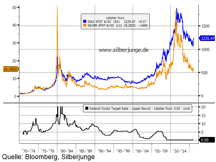 Der folgende Chart zeigt den Goldpreis in Blau, den Silberpreis in Hellorange sowie den US-Leitzins in Schwarz: