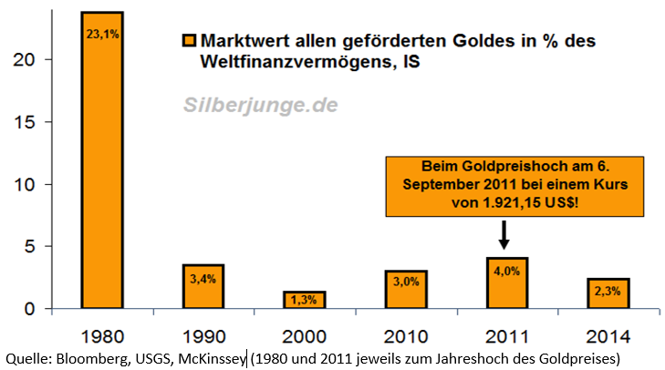 Wie kommen wir dazu, in Bezug auf das Gerede von George Soros über eine "ultimativen Blase" des Goldpreises von einer Märchenstunde für die Weltöffentlichkeit zu reden? Betrachten wir den Wert allen geförderten Goldes in Prozent des jeweiligen Weltfinanzvermögens zu großen Krisenzeiten. Wir erkennen eine atemberaubende  Aufblähung des Weltfinanzvermögens. Und nun lassen Sie uns gemeinsam untersuchen, wie hoch der Wert von allem in der Menschheitsgeschichte geförderten Goldes gemessen  am Weltfinanzvermögen ist. Das wird jedes Jahr von uns ermittelt. Wir waren im Jahr 1980, als das Gold im Januar sein Hoch bei 850 US Dollar hatte, bei einem Anteil von über 23 Prozent. Im Jahr 1989 waren wir bei fast dreieinhalb Prozent. Als dann der Goldpreis im Jahr 2000 sein Tief bei rund 255 US Dollar pro Feinunze erreicht hatte, da machte der Anteil des Goldes am Weltvermögen 1,22 Prozent aus Heute liegen wir bei rund 2,5 Prozent. Und wir waren, um das nur nochmals hinzuzufügen, im September 2011, als der Goldpreis sein Hoch sah bei über 1100 Dollar, gerade mal bei 4,6 Prozent.